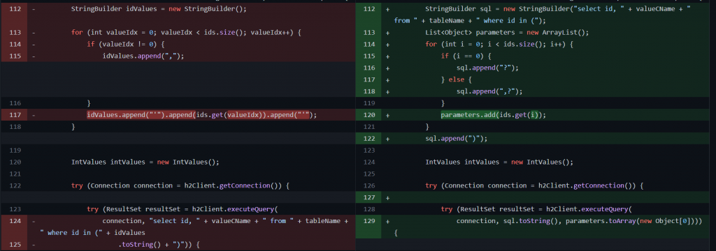 可以看到,在原版本中idValues是直接拼接过去的,修复后的代码引入了?进行占位预编译