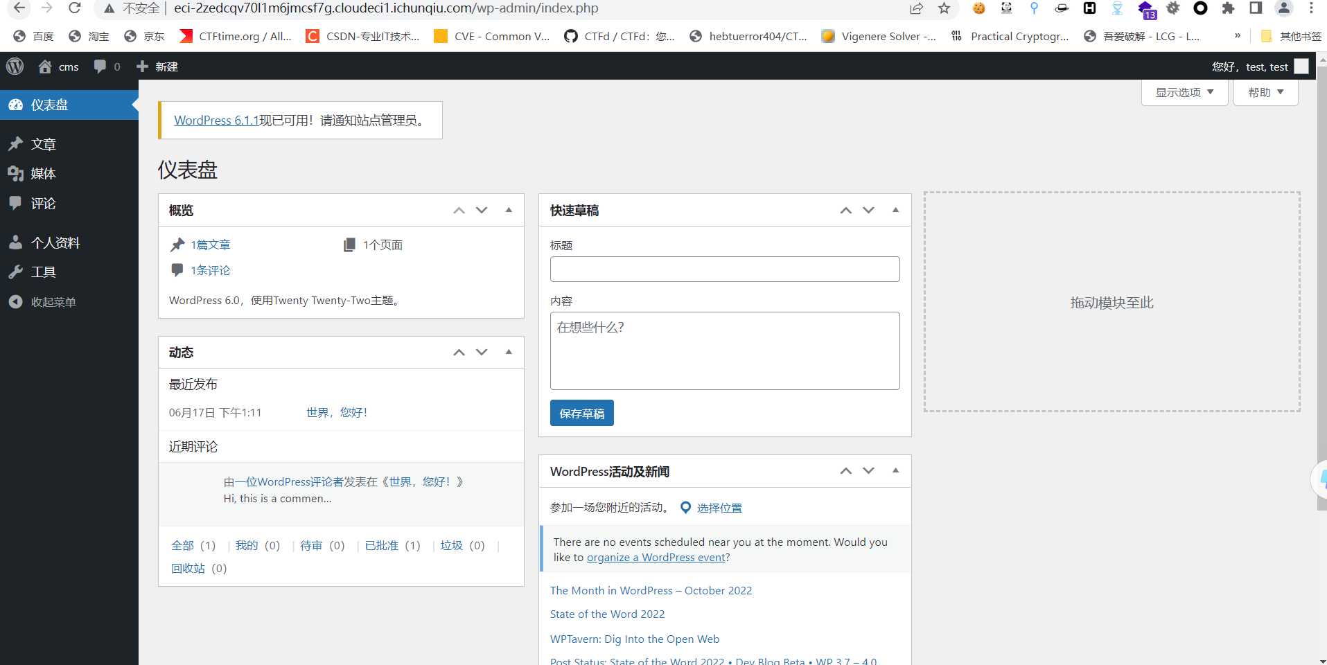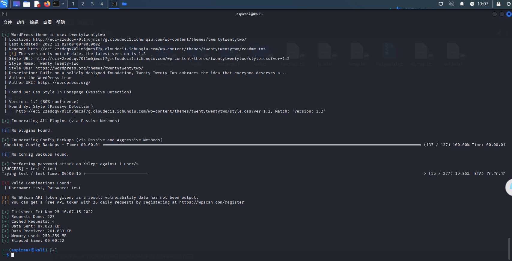 直接挂 wpscan 开扫,默认用户名 test,字典用/usr/share/wordlists