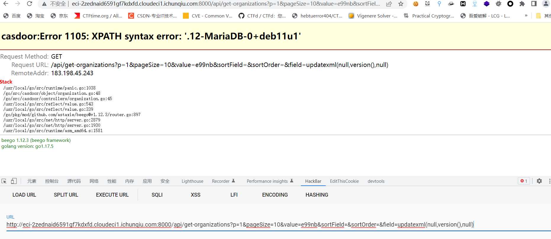 在第二个if也就是filed那里,用fmt.Sprintf格式化字符串拼接,直接造成注入,再加上有panic()捕获异常,直接报错注入