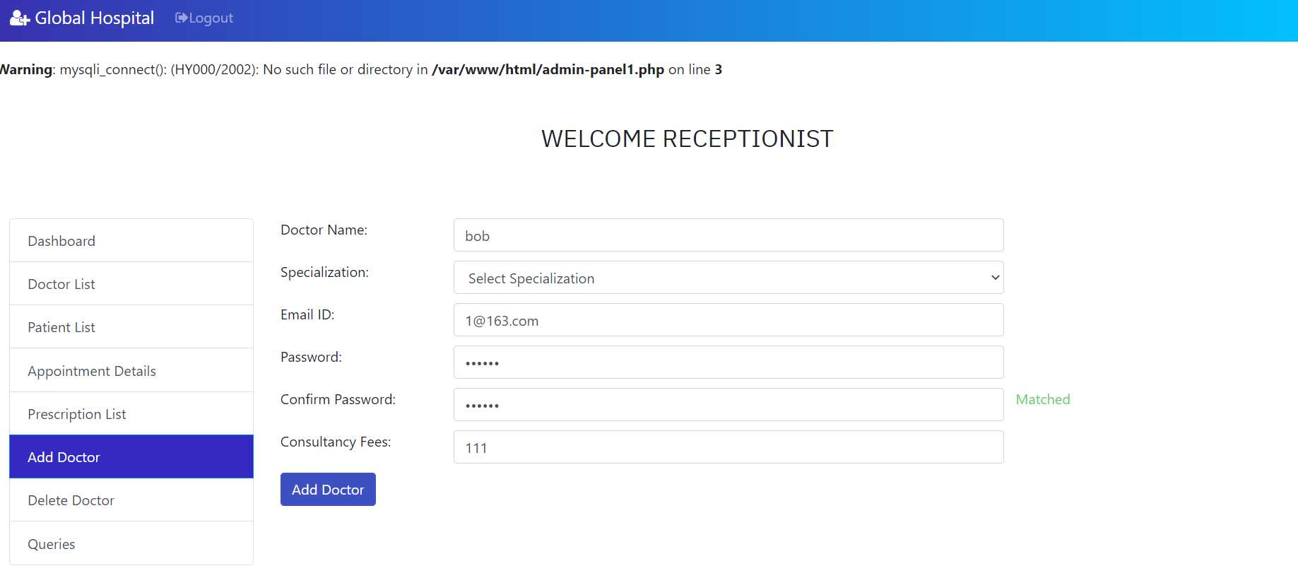 admin/admin123 进后台,在 Add Doctor 这里可以注入