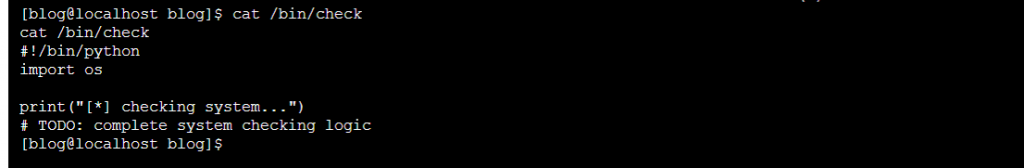 注意到 /bin/check 里面导入了 os 模块但是没使用,同时 os.py 可写;所以思路其实就是把 /usr/lib64/python2.7/os.py 改为 system('bash'),然后 sudo /bin/check 执行提权