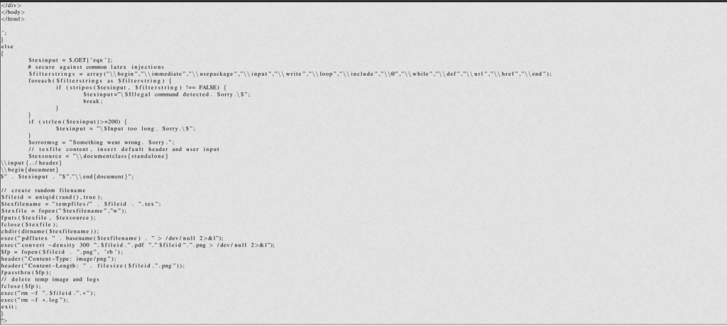 再读下源码 \lstinputlisting{../equation.php},可以看到 \begin{}和 \end{} 都没了,所以没办法写🐎;\write 和 \immediate 以及 \def 也没了,没办法执行命令