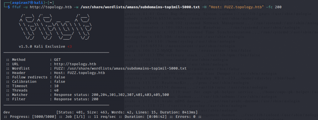 /etc/shadow 是读不了的,需要 root 权限;再回到刚刚读到的 /etc/passwd,可以发现存在用户 vdaisley,同时用 ffuf 扫子域名的时候,发现 dev.topology.htb 是 401 状态,需要用户名密码登录