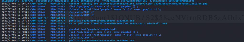 再 ./pspy64s > 124.txt,因为靶机是公用的,所以看着有点乱,但不难发现大家都在执行定时任务,而且和 gnuplot 有关