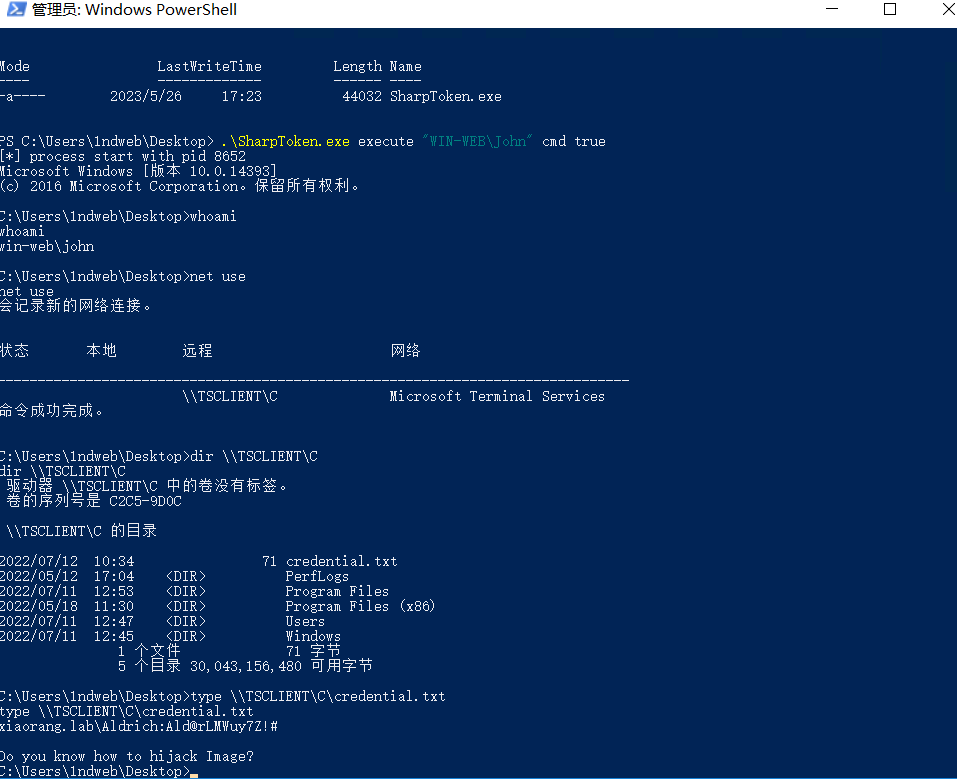 但是模拟后在 net use 下并没有看到共享文件;改用 SharpToken.exe 模拟,先在服务器上安装 .NET 3.5,管理员模式下执行 PowerShell