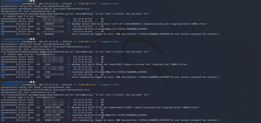 proxychains crackmapexec smb IP -u 'Aldrich' -p 'Ald@rLMWuy7Z!#' --loggedon-users