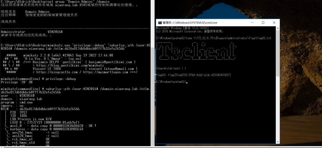 拿到后直接 mimikatz.exe 传递访问域控,查看 flag03.txt