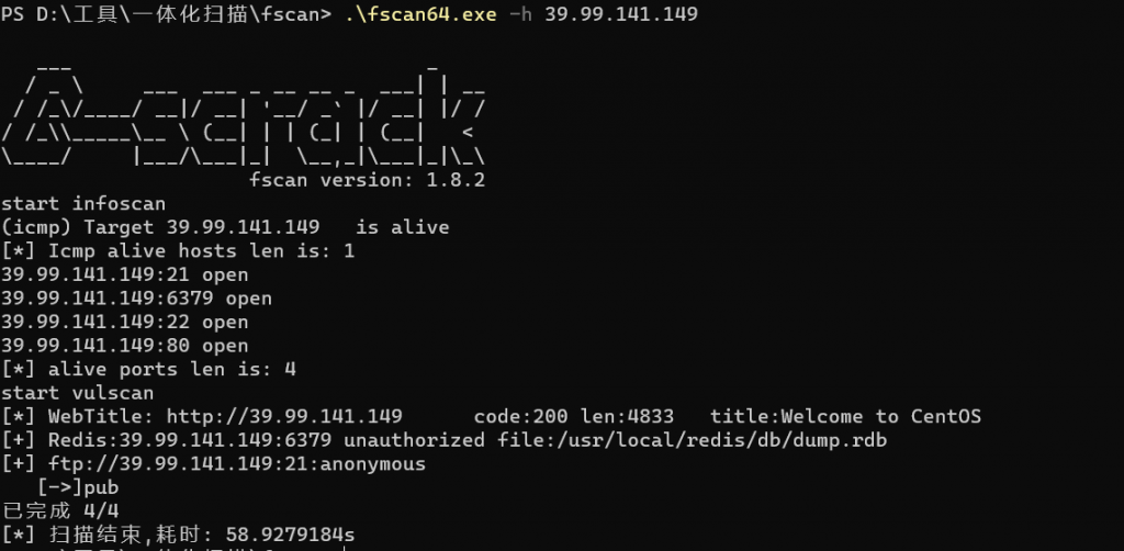 fscan 扫描 IP,存在 redis 未授权和 ftp 默认用户