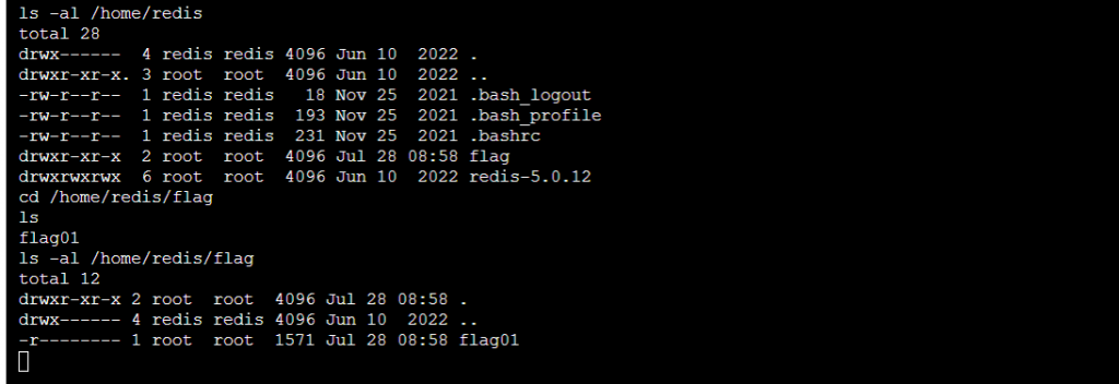 在 /home/redis/flag 下找到 flag,但是没有权限读取,考虑提权